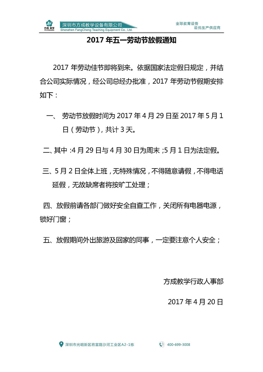 2017年4月29日至2017年5月1日(勞動節),共計3天,請廣大客戶提前做好備貨準備。