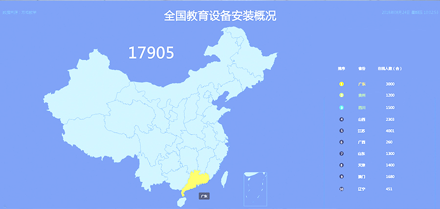 設(shè)備集控軟件,用于教學(xué)設(shè)備的班、校、縣、市、區(qū)、省的逐級(jí)管理。教育部門可以通過設(shè)備集控軟件中的設(shè)備地圖查看本地區(qū)所