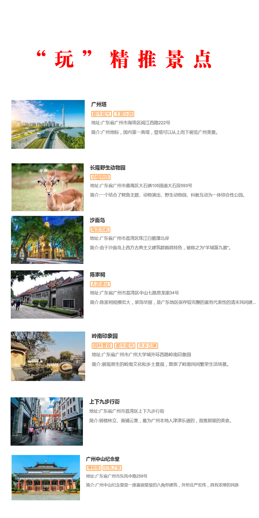 "廣州的景點怡人,以羊城新八景、花卉博覽園、花都香草世界、華南植物園等最為盛名,還有異域風情的沙面和擁有130多年歷史的石室圣心大教堂,及陳家祠、現(xiàn)代化建筑廣州塔和已有2100多年歷史的南越王墓都是值得一看的地方。"