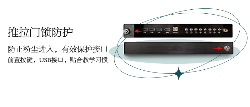 機(jī)身保護(hù)——獨特的推拉門鎖設(shè)計,保護(hù)前置按鍵及接口,還能收納白板筆和教鞭;