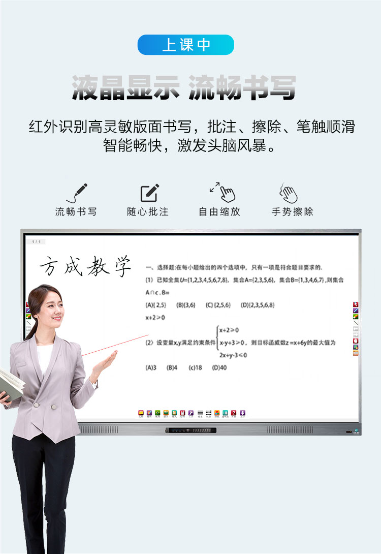 超窄邊多媒體教學一體機-超窄邊框三等邊超窄邊框設計,推拉門鎖保護,4K超高清顯示,以人機交互的方式,搭載互動白板和無線投屏軟件,實現多人書寫、互聯互通的互動教學模式,豐富課堂內容,提高學習氛圍。