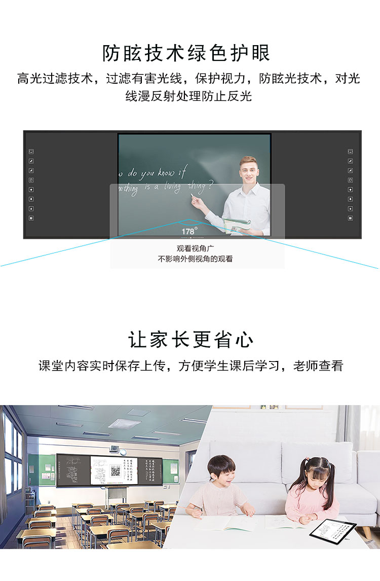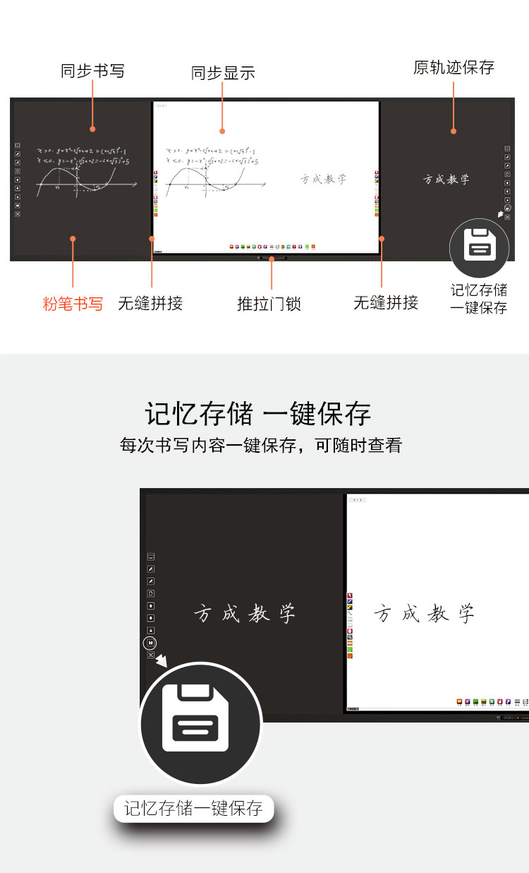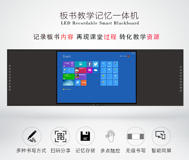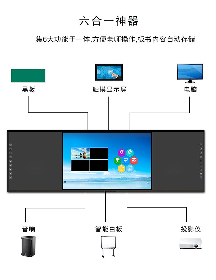 觸摸屏一體機集電腦、音箱、展臺、智能中控、白板于一體,采用一體化無縫拼接設計美觀大氣,電控展臺方便收納,紅外二十點觸控滿足多人同時書寫,板面采用冷軋面板防撞防刮,尺寸擴展性強,滿足不同教學場景需求。
